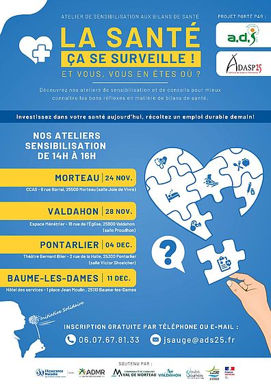 ADS et l’ADASP25 (pôle santé prévention de la Fédération ADMR du Doubs), avec le soutien de la CPAM, organisent un atelier de sensibilisation à l’Espace Ménétrier de 14h à 16h. Cet atelier a pour objectif de favoriser le suivi médical et l’accompagnement santé des publics en situation de fragilité, en lien étroit avec les acteurs médico-sociaux locaux.