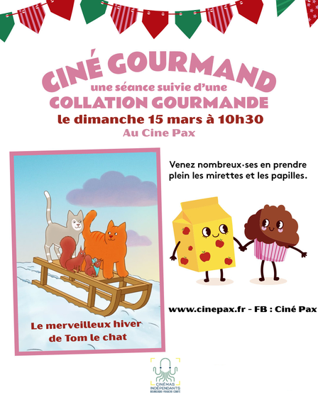 Ciné gourmand au ciné pax à 10h30. Projection du film d’animation « Le merveilleux hiver de Tom le chat » suivi d’une collation gourmande. Tarif : 4,5€