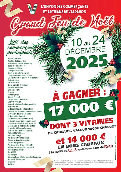 Grand Jeu de Noël organisé par l’UNYON des commerçants et Artisans de Valdahon. À gagner, 17000 € dont 3 vitrines de cadeaux (valeur chacune de 1000€) et 14000€ en bons cadeaux (14 bons de 100€ et le reste en bons de 20€).