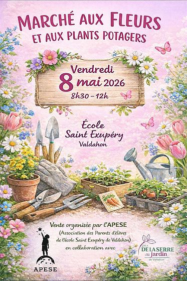 Marché aux fleurs et aux plants potagers avec De la serre au jardin de 8h30 à 12h à l’école Saint-Exupéry. Vente organisée par l’APESE (Association des Parents d’élèves de l’école Saint-Exupéry).